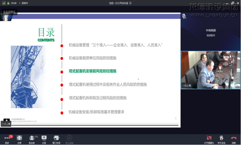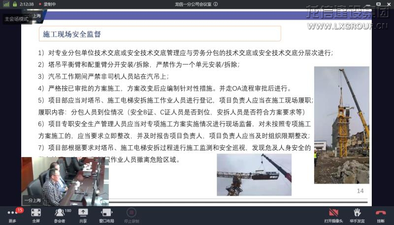 2021年4月17日上午,龍信集團一分公司建筑大型機械安拆施工網絡視頻培訓會在東方城市大廈16樓舉辦。一分公司工程部相關人員、區域工程部經理、安全主管、設備主管、技術主管、項目經理、項目安全負責人、機管員及技術負責人等240多人參加了此次培訓。